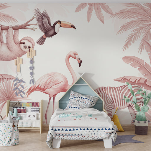 KidsWallAdd a touch of magic to your child's room with this kids room wallpaper featuring adorable animals. A pink flamingo, a curious raccoon, and a misch...