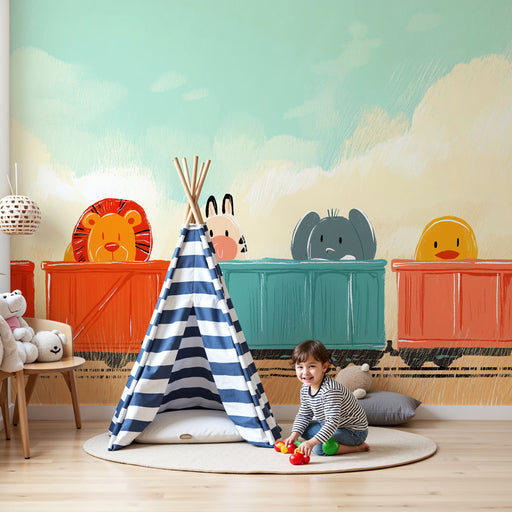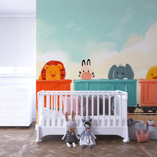 KidsWallEmbark on a playful adventure with this kids room wallpaper, where a train filled with fun animals parades against a peaceful backdrop. Each carria...