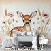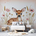 Add a touch of softness and nature to your child's room with this kids room wallpaper featuring an adorable fawn resting amidst delicate flowers. The fawn, with its brown coat sprinkled with small white spots, evokes a sense of peace and charm, while the colorful flowers and wheat stalks surrounding it create an enchanted setting.