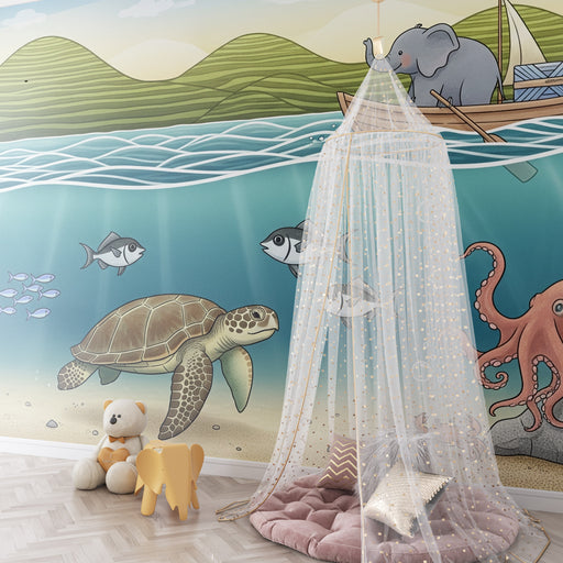 The collection celebrates the emotional intelligence of these creatures through designs that nurture sensitivity. From minimalist patterns to detailed frescoes, the benevolent elephants come in realistic or stylized versions, depicting tender moments between mother and child. For a more wild atmosphere, explore our jungle and forest mural wallpaper in decor. The scenes capture these gentle giants in their daily lives: intertwined trunks, playful dust baths, and moments of family bonding. The selected materials respect the texture of their characteristic skin, while careful finishes highlight the deep gaze of these endearing animals. These guardians of the savanna transform the room into a peaceful sanctuary where strength meets gentleness.