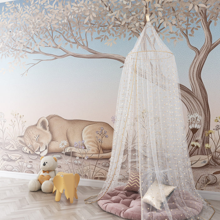 Cree un refugio de paz en la habitación de tu hijo con este papel pintado infantil que representa a un adorable cachorro de león durmiendo pacíficamente en medio de un paisaje pastoral. Bajo la sombra de un delicado árbol, este joven felino descansa rodeado de flores coloridas y hojas, disfrutando de un cielo degradado en suaves tonos de azul y rosa.