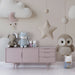 Los tonos relajantes de beige y verde crean un ambiente sereno, ideal para momentos de descanso y cariño. Las nubes en relieve en la pared aportan una dimensión lúdica y cálida, convirtiendo esta habitación en un verdadero nido de suavidad.