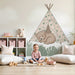 Los tonos suaves y neutros crean un ambiente cálido y acogedor, ideal para momentos de descanso y cariño. Cada detalle, desde el pelaje del osito hasta los sutiles patrones de la tienda, está cuidadosamente ilustrado para estimular la imaginación de los más pequeños.