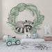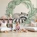Transforma la habitación de tu bebé en un espacio acogedor con este papel pintado para bebé que representa a un adorable mapache dormido, rodeado de exuberantes hojas. Este diseño relajante invita a la dulzura y la serenidad, perfecto para crear un ambiente relajante para tu pequeño.