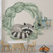 Los delicados tonos verdes de las hojas tropicales aportan un toque natural y fresco, mientras que el mapache, con su pelaje suave y sus ojos cerrados, evoca una sensación de seguridad y comodidad. Cada detalle está cuidadosamente ilustrado para ofrecer un ambiente armonioso y acogedor.