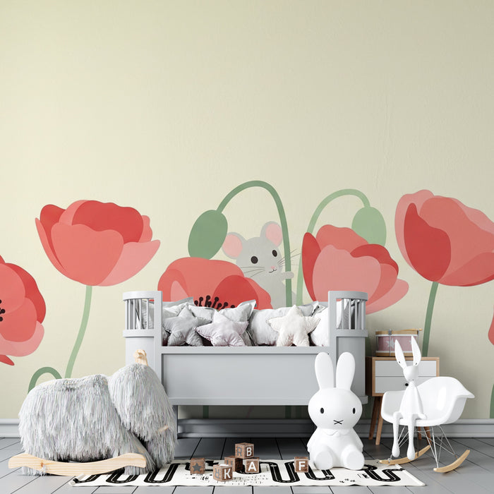 Papel pintado infantil | Ratones y amapolas en flor