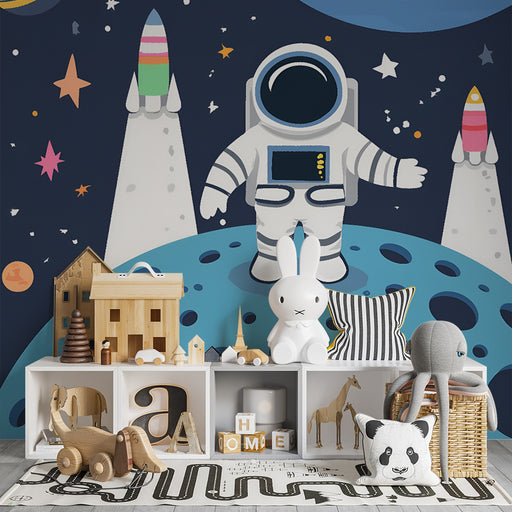 Transforma la habitación de tu hijo en un lugar de aventuras intergalácticas con este papel pintado para habitación infantil, adornado con adorables osos astronautas. Cada oso, vestido con su traje espacial, flota con gracia sobre un fondo azul calmante, salpicado de estrellas brillantes y arcoíris coloridos.