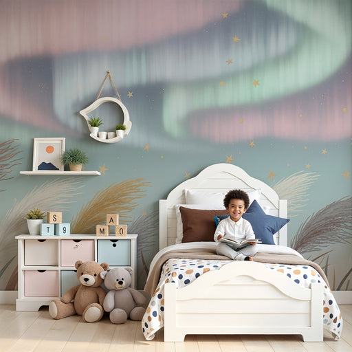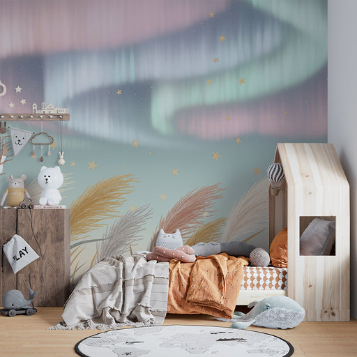 Ver todos los detallesPapel pintado infantil | Dulces hierbas bajo las auroras boreales estrelladas