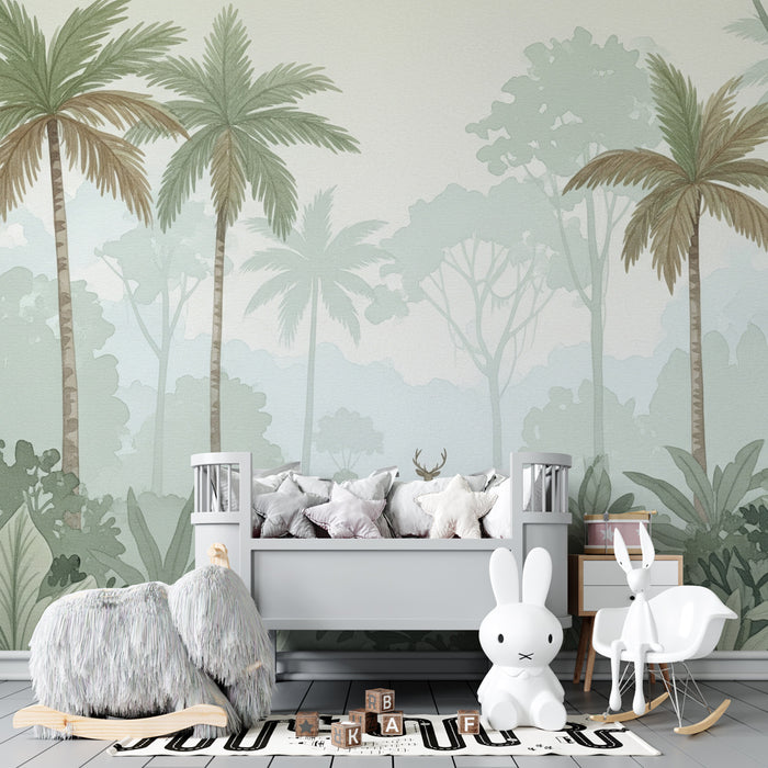Las majestuosas palmeras y la densa vegetación, pintadas en tonos suaves de verde y beige, crean una atmósfera serena propicia para la relajación y la imaginación. Cada detalle está cuidadosamente elaborado para ofrecer un efecto armonioso, mientras que el desenfoque del fondo aporta una sensación de profundidad y tranquilidad, ideal para la zona de lectura o los momentos de creatividad.