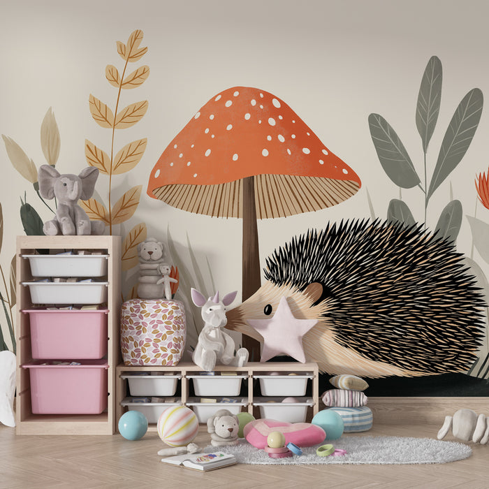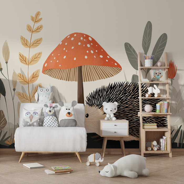 Ofrezca a la habitación de su hijo un toque de naturaleza con este papel pintado infantil que representa a un adorable erizo descansando bajo un colorido hongo. Rodeado de follaje estilizado y delicadas flores, esta decoración evoca una atmósfera suave y serena, perfecta para estimular la imaginación de los más pequeños.