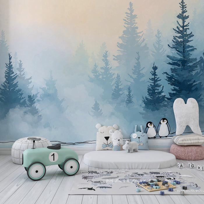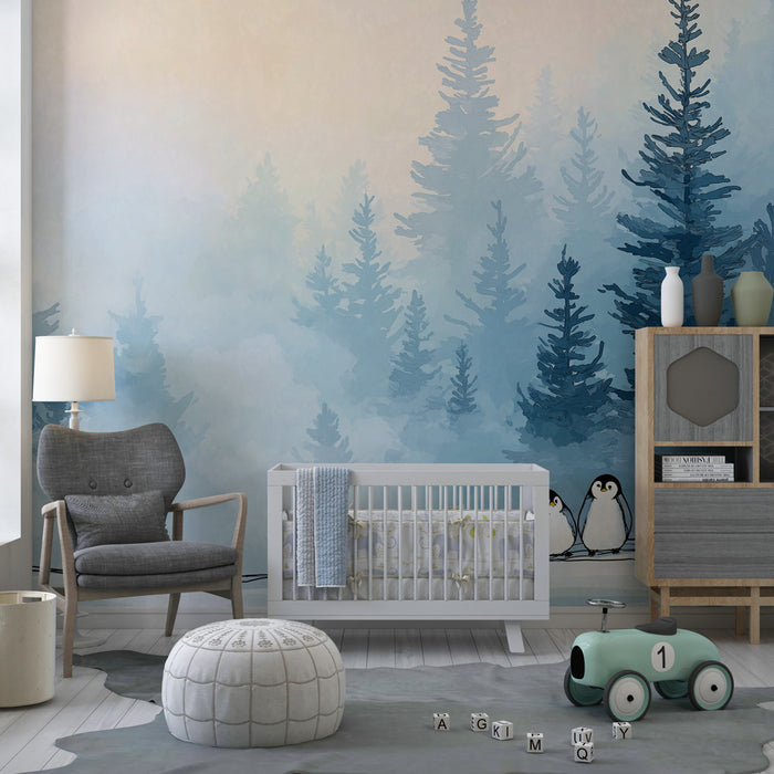 Transforme la habitación de tu bebé en un lugar encantador con este papel pintado para bebé que representa una escena invernal tranquila. En el corazón de un bosque de coníferas, tres adorables pingüinos se mueven en un paisaje helado, creando una atmósfera de suavidad y tranquilidad.