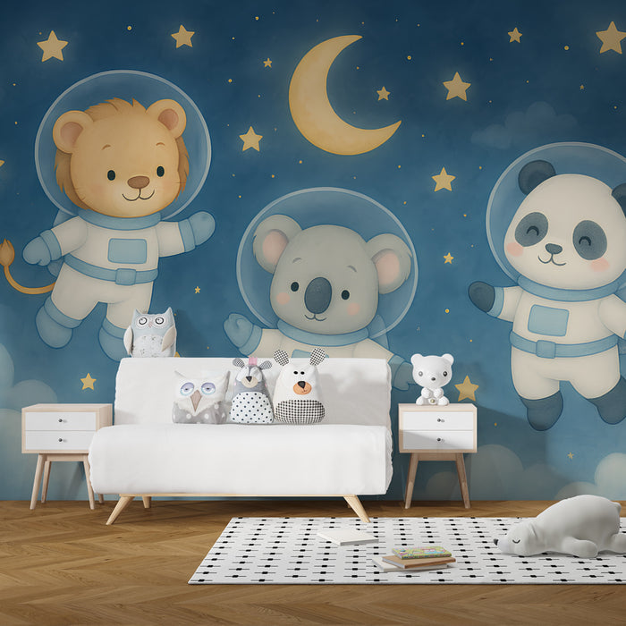 Transforma la habitación de tu hijo en un universo intergaláctico con este papel pintado divertido para niños. Cuatro adorables animales, incluyendo un león, un koala y un panda, flotan alegremente en el espacio, vestidos con sus brillantes trajes espaciales. Rodeados de estrellas brillantes y una suave luna, invitan a la aventura y la exploración.