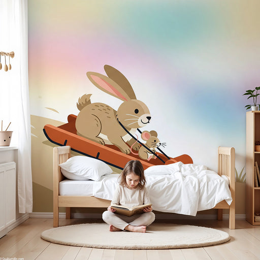 Sumérgete en el universo lúdico y encantador de este papel pintado infantil que presenta a un adorable conejo y un pequeño ratón bajando en trineo....