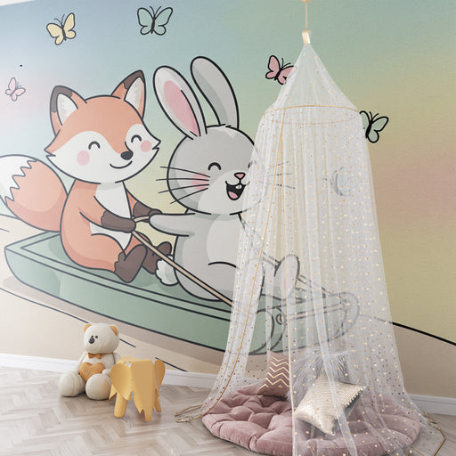 Papel pintado infantil | Pequeño zorro y conejo feliz