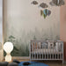 Las delicadas tonalidades de verde y gris se mezclan armoniosamente, aportando un toque de naturaleza relajante al espacio. Cada árbol, ligeramente difuminado por la niebla, evoca una sensación de misterio y tranquilidad, perfecta para estimular la imaginación de los más jóvenes.
