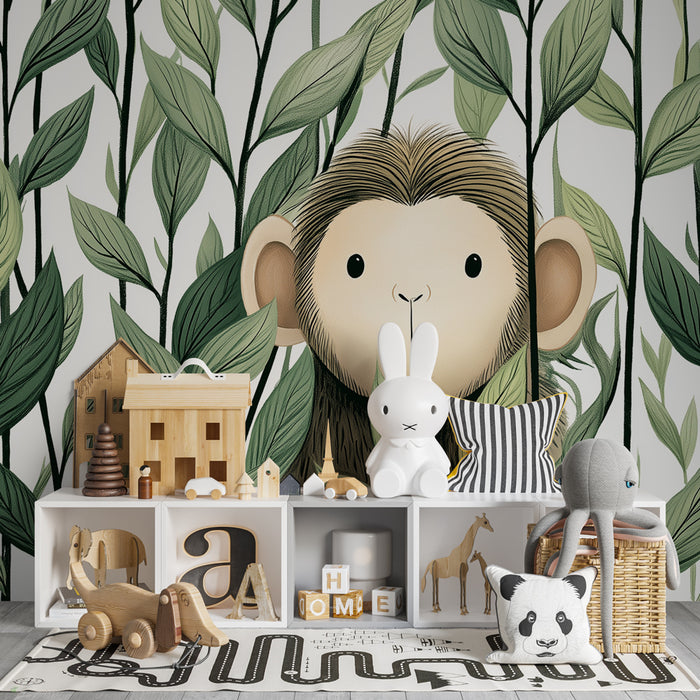 Transforma la habitación de tu hijo en un verdadero jardín de maravillas con este papel pintado infantil cautivador. Un adorable mono emerge de un exuberante paisaje de hojas delicadas, creando un espacio encantador y lleno de aventuras. Su mirada curiosa invita a la exploración, dejando espacio para la imaginación.