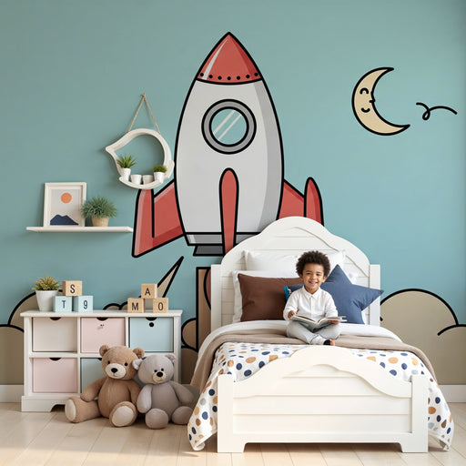 Ofrece a tu hijo un viaje interestelar con este papel pintado infantil en tonos cálidos y poéticos. Un cohete rojo y blanco se lanza en un cielo salpicado de estrellas centelleantes, atravesando nubes algodonosas con reflejos dorados. En este universo infinito, los planetas majestuosos y las constelaciones brillantes despiertan la imaginación e invitan a la aventura.