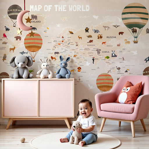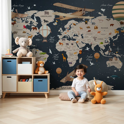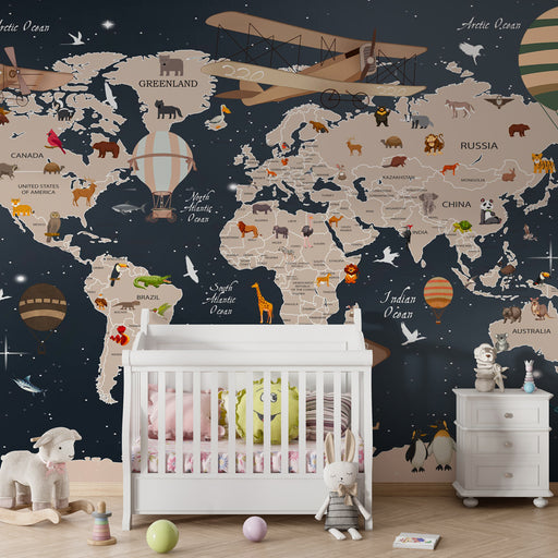 Cierra los ojos e imagina un mapa del mundo pintado en acuarela, donde cada continente cobra vida a través de animales majestuosos, paisajes encantadores y océanos poblados de criaturas fascinantes. Este papel pintado infantil es una verdadera invitación a la evasión, donde la dulzura y la aventura se entrelazan para crear un universo propicio para los sueños y el descubrimiento.