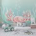 Sumérgete en el tranquilo mundo de los fondos marinos con este papel pintado infantil, que presenta una adorable criatura marina. Envuelta en delicados corales y rodeada de burbujas, esta pequeña criatura dormida evoca tranquilidad y sueños.
