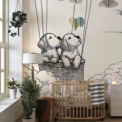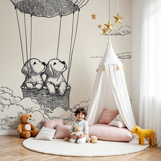 KidsWallBrinda un toque de sueño y aventura a la habitación de tu bebé con este papel pintado infantil que representa a dos adorables cachorros flotando pa...