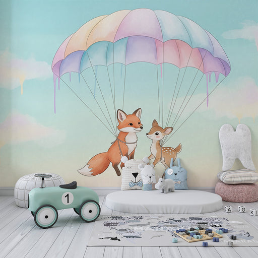 Ver todos los detallesPapel pintado infantil | Zorro y cervatillo en paracaídas