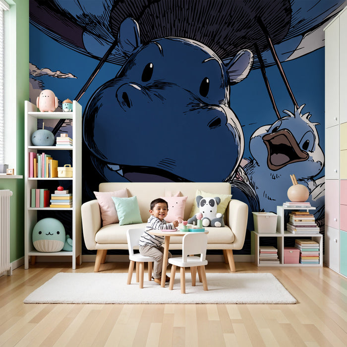 Papel pintado infantil | Aventura en el cielo con un hipopótamo y un pato