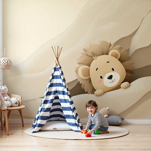 KidsWallTransforma la habitación de tu pequeño aventurero con este papel pintado infantil encantador, protagonizado por un león soñoliento frente a un tipi...