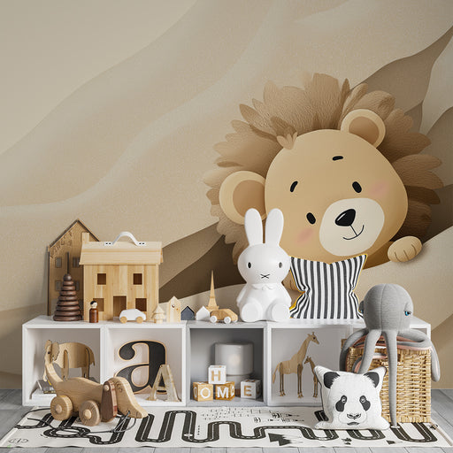 Ver todos los detallesPapel pintado infantil | Pequeño león lindo emergiendo de las dunas de arena