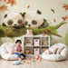 Transforma la habitación de tu bebé en un dulce capullo con este papel pintado infantil que ilustra a dos adorables pandas pacíficamente dormidos en una rama. Rodeados de delicadas hojas de otoño, esta escena tranquila invita a la serenidad y la ternura.