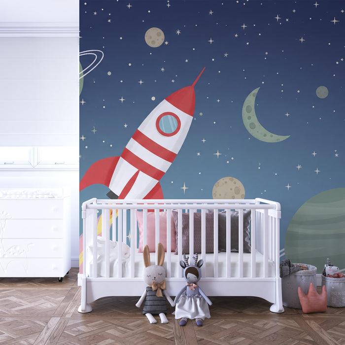 Embárquese en una aventura intergaláctica con este papel pintado infantil que presenta un dinámico cohete surcando el espacio estrellado. Rodeado de fascinantes planetas y misteriosas lunas, esta escena cósmica despertará la curiosidad y la imaginación de su pequeño explorador.