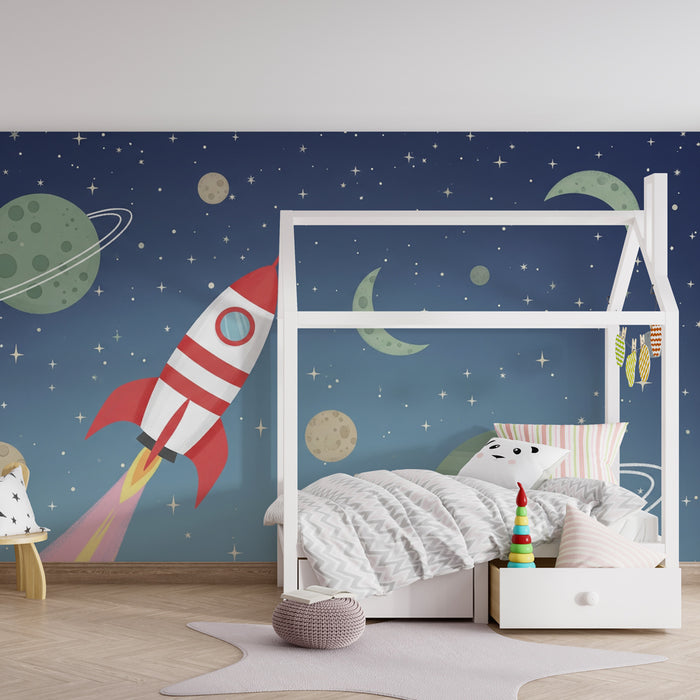 Papel pintado infantil | Viaje espacial y cohete colorido