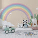 Teisendage oma beebi tuba õrnuse maailmaks selle beebi tapeediga, kus on kujutatud armas pandakaru istumas eredas vikerkaares. Vikerkaare pastelsed värvid lisavad võlu ja harmooniat, samas kui pehmed pilved ja palmid loovad rahustava õhkkonna.
