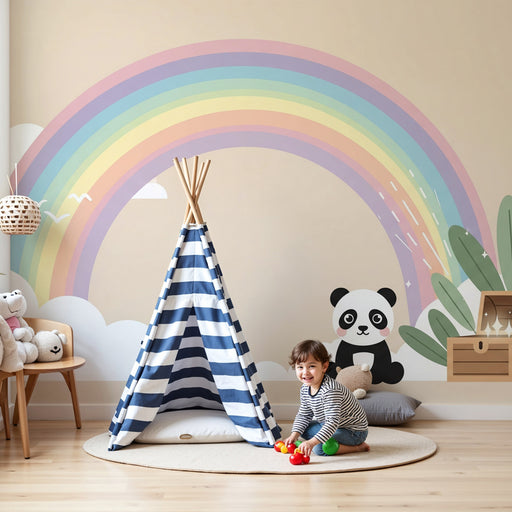 KidsWallTeisendage oma beebi tuba õrnuse maailmaks selle beebi tapeediga, kus on kujutatud armas pandakaru istumas eredas vikerkaares. Vikerkaare pastelsed...