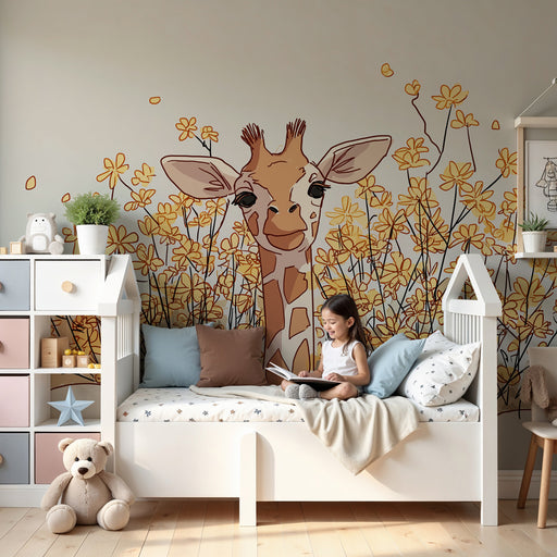 Kuva kõik üksikasjadKids room wallpaper | Happy giraffe in the middle of flowers