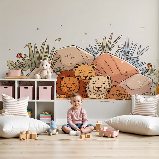 KidsWallTeisaldage oma lapse tuba metsiku kuningriigina selle armsate väikeste lõvidega, kes on koos kerra tõmbunud, kujutatud lastetubade tapeet. Need arm...