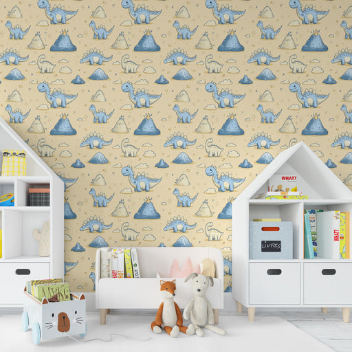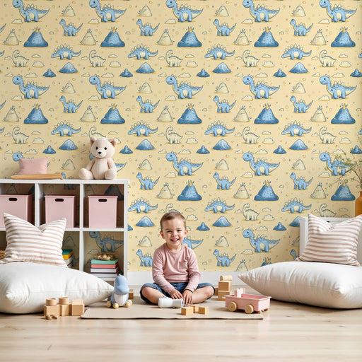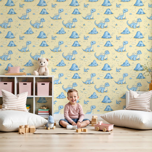 KidsWallTeisaldage oma väikese lapse tuba selle dekoratiivse tapeediga, kus on lõbusad dinosaurused pehmetes sinistes toonides rahustaval kollakal taustal....