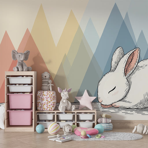 Kuva kõik üksikasjadKids room wallpaper | Sleeping kitten in the middle of colorful mountains