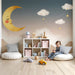 Beži ja sinise pehmed toonid loovad rahuliku ja lõõgastava keskkonna, ideaalse uinumise jaoks. Iga detail, alates kuu roosadest põskedest kuni pilvede rõõmsate nägudeni, toob ruumi õrnuse ja võlu. See beebi toa tapeet on ideaalne kujutlusvõime stimuleerimiseks, pakkudes samal ajal lohutavat ruumi.