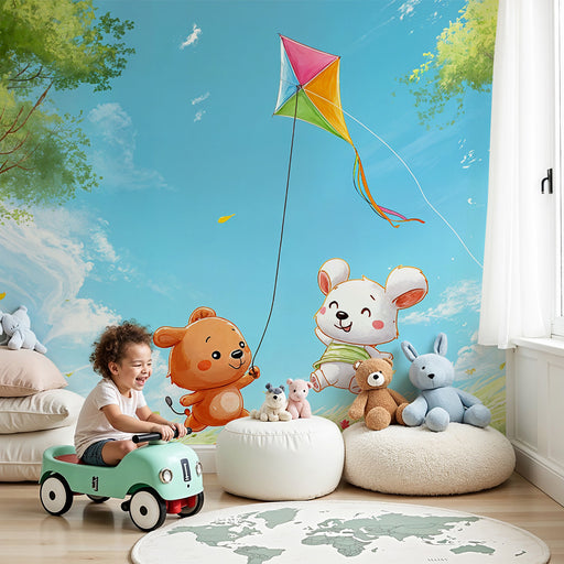 Kinderkamer behang | Vrolijke panda en vlieger in de lucht