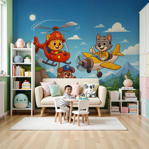 Avastage meie õhuseikluste tapeet, mis kujutab võluvaid loomi lendamas maaliliste maastike kohal. Punase helikopteri, kollase lennuki ja rõõmsate t...