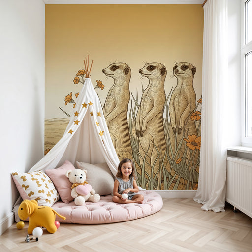 KidsWallLisagez une touche d'aventure dans la chambre de votre enfant avec ce papier peint pour enfants mettant en scène des suricates curieux. Ces adorabl...