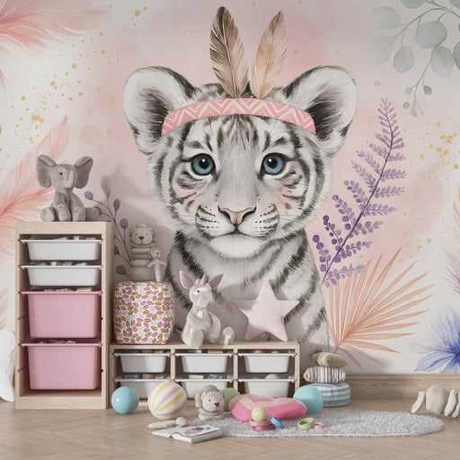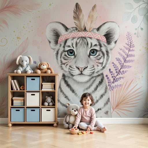 KidsWallMuutke oma lapse tuba šikkaks ja võluvaks ruumiks selle lastele mõeldud tapeediga, kus on armsad valge tiiger. Kaunistatud värviliste sulgede kroon...