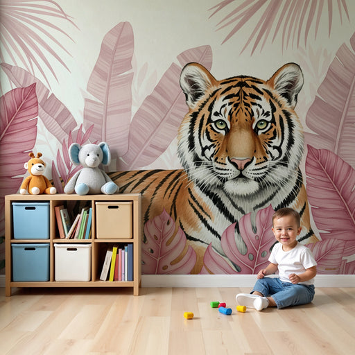 KidsWallMuutke oma lapse tuba selle paeluv tapeet esindades uhke tiiger, kes puhkab troopiliste lehtede luksuses. Õrnad roosa ja rohelise toonid loovad rah...