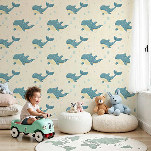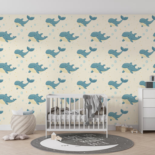 Kids room wallpaper with patterns | Cute blue whales on a cream background