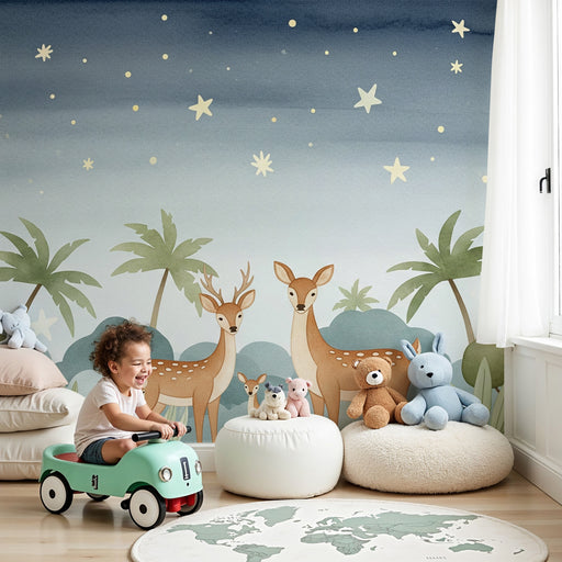 KidsWallSukelduge võluvasse maailma selle lastetapetiga, mis kujutab õrna öist stseeni, kus perekond hirvi seisab rahulikult tähtede all. Rahustav kontrast...