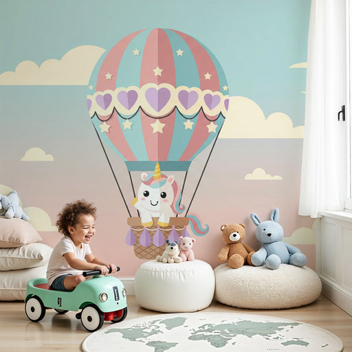 KidsWallPõgenege võlumaailma selle armsa lastetapetiga, mis kujutab endast võluvat ükssarve, kes sõidab uhkes õhupallis. Selle õrnade värvide ja võluvate m...