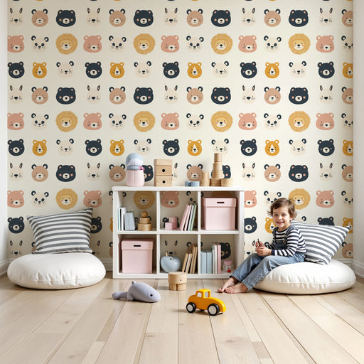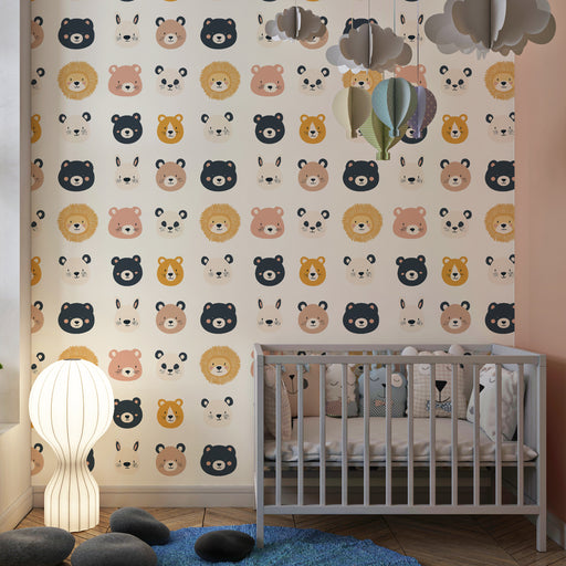Kids room wallpaper with patterns | Adorable animal heads on a light background