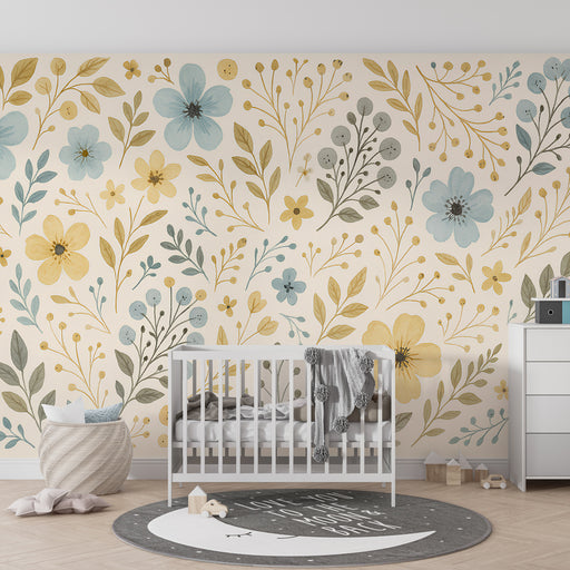Kuva kõik üksikasjadKids room wallpaper | Õrnad lilled sinisel ja kreemikal taustal