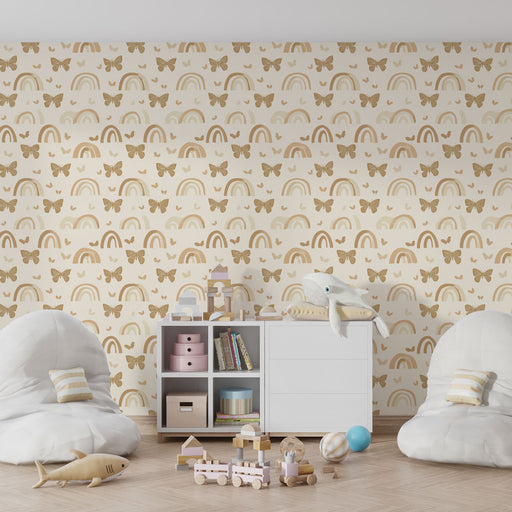 Lastetuba tapeet mustritega | Vikerkaar ja kuldseid liblikaid kreemika taustaga