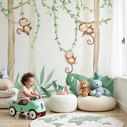Kids-wall.com luo trooppisia maailmoja, jotka herättävät uteliaisuutta ja ruokkivat seikkailunhalua. Kokoelmamme muuntaa lastenhuoneet eläväksi viidakoksi, jossa apinat ovat jokapäiväisiä leikkikumppaneita. Anna näiden kuosien tuoda kädellisten leikkimielinen henki kotiisi ja luoda ympäristö, joka innostaa oppimaan ja pitämään hauskaa.